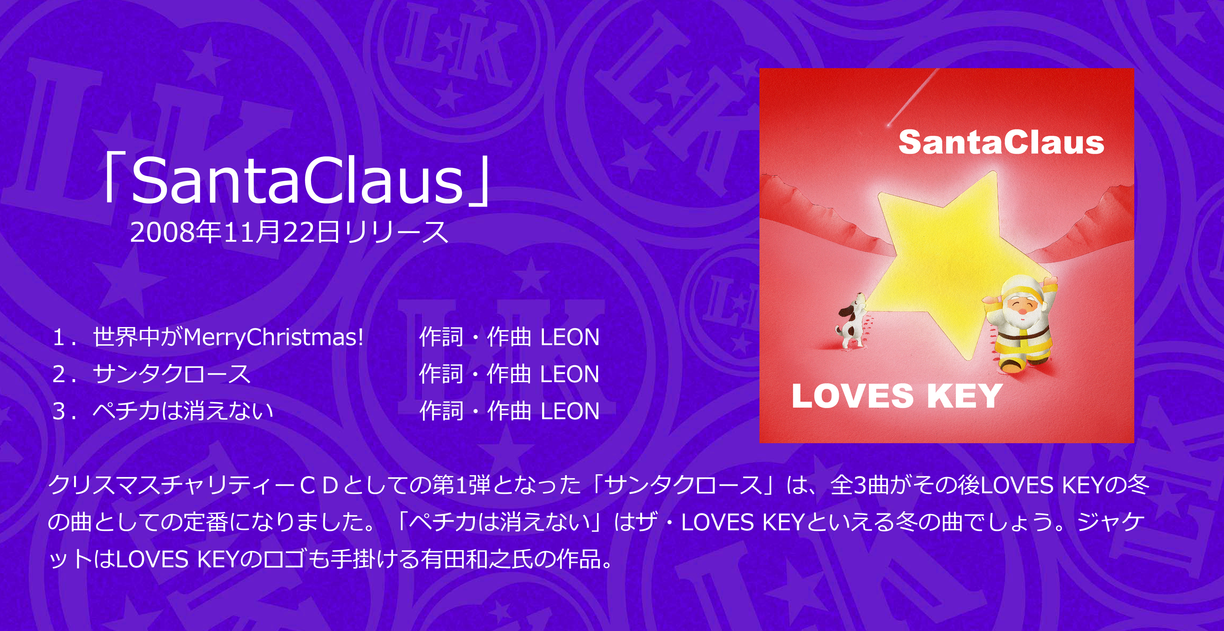 活動休止前に発表された「白いサンタクロース」。LOVES KEYらしさを集結されたような1曲で発表から6年後となる2017年のニューアルバムには再レコーディングした同曲も収録される。